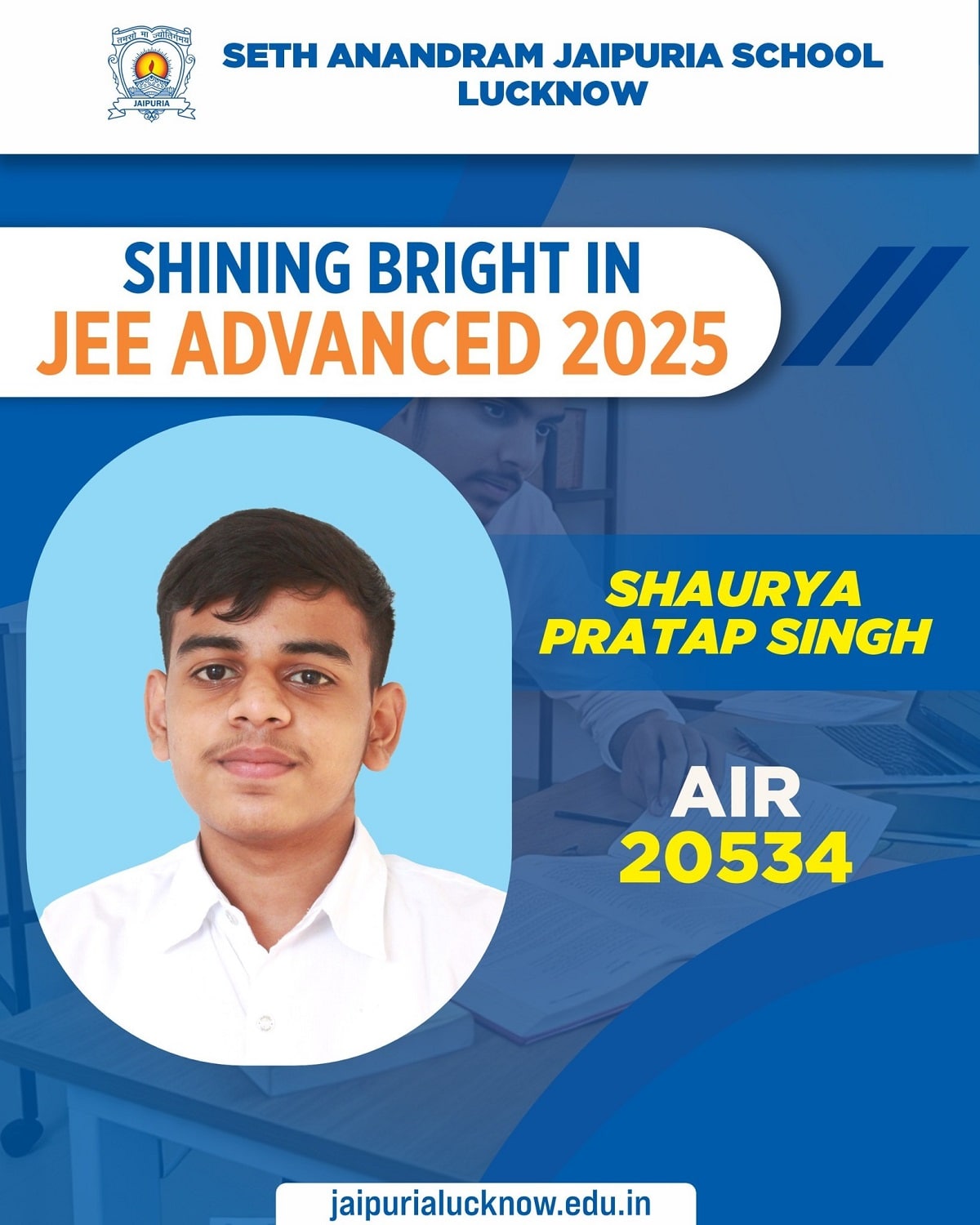Seth Anandram Jaipuria School, Lucknow, proudly congratulates Shaurya Pratap Singh on securing an All India Rank of 20534 in JEE Advanced 2025. His dedication and hard work have made us proud. Wishing him continued success in his journey ahead, a bright future awaits our aspiring engineer.