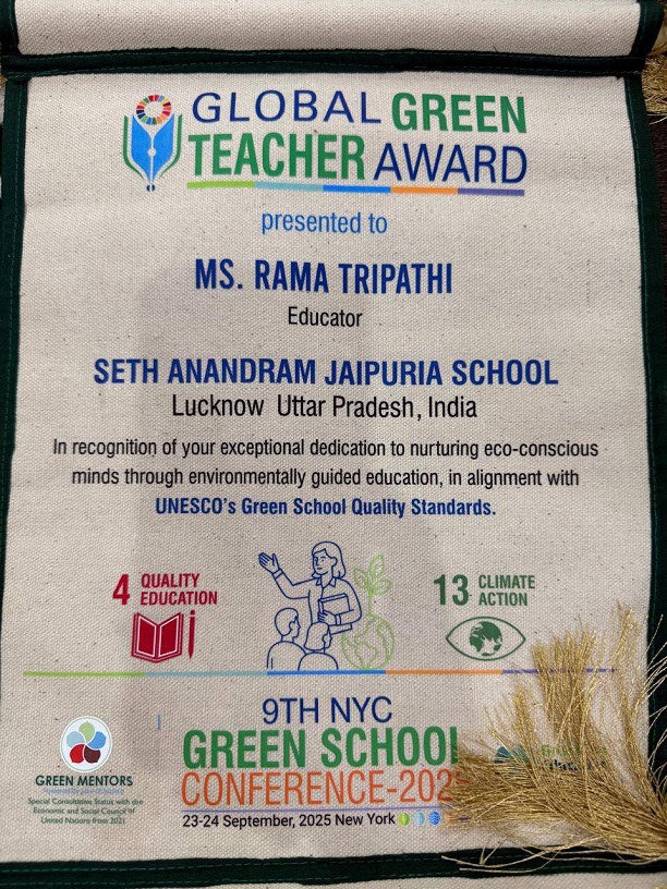 We are overjoyed to share that Ms. Rama Tripathi, faculty member of Seth Anandram Jaipuria School, Lucknow, has been conferred with the prestigious Global Green Teacher Award at the NYC Green School Conference 2025!